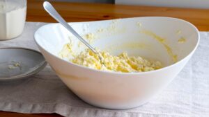 В друг съд разбиваме яйцата, прибавяме предварително натрошеното сирене и останалите продукти и ги разбъркваме. Щом „шупне“ млякото, сипваме и другата смес в купата. Всичко се разбърква много добре.