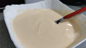 Най-напред в подходящ съд (дълбока купа примерно) смесваме жълтъка/ците, киселото мляко, 2-3 капки оцет и брашното. Разбъркваме добре до получаване на гладка и хомогенна смес.