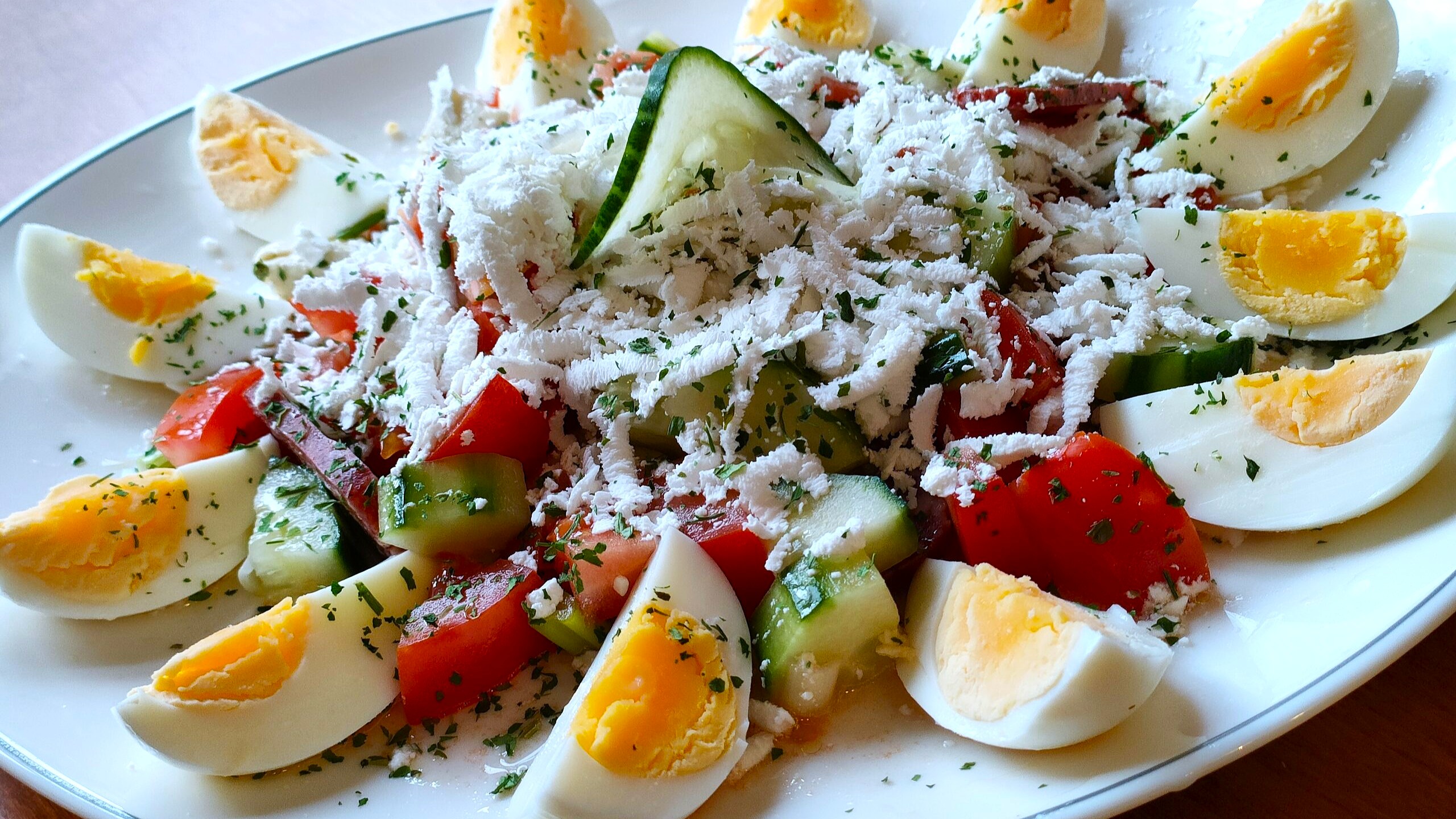 Изсипваме от салата в подходяща чиния и я оформяме като купчинка. Поръсваме я с настъргано сирене. Отстрани подреждаме нарязаното варено яйце. Можем да я украсим допълнително с парченца домат, нарязан на полумесеци лук, краставица или маслини.