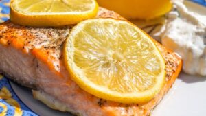 Сьомга с лимони на фурна – истински уникална вкусотия. Една от най-полезните риби. Месото на сьомгата е с високо съдържание на протеини, витамини A, D и селен. Минерал, който стимулира производството на антитела в организма. Тя е отличен източник на омега-3 мастни киселини, които регулират дейността на белите кръвни клетки.