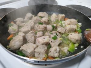 • Следващата стъпка е запържването. Загряваме олио в тигана и слагаме месото. Пържи се като се разбърква около 5-6 минути, след като започне да побелява се добавят лукът и морковите. Запържват се 3-4 минути и тогава се посолява и подправя със черен пипер и джоджен.