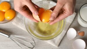 Най-напред слагаме да се затопли млякото (не трябва да е горещо, а леко затоплено). През това време чукваме яйцата в подходяща купа и после внимателно разделяме жълтъците от белтъците. Оставяме белтъците настрана.