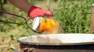 Така приготвените буркани слагаме да се варят в подходящ съд. Като ги залеем, водата трябва да покрива бурканите (един пръст над капачките). Стерилизираме в продължение на 10-12 минути, след като водата заври. Изваждаме ги с подходяща щипка и ги обръщаме с капачките надолу.