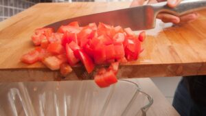 Измиваме ги и ако са с дебели кожички ги обелваме. Става лесно като потопим доматите във вряла вода за около минута и после веднага ги сложим в студена да се охладят. След това избираме подходящ съд и нарязваме доматите вътре. Режем на едри кубчета или късове.