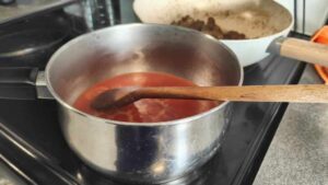 Продължаваме със соса, като най-напред размиваме меда в 1/2 ч.ч. вода. После в подходяща тенджерка събираме всички продукти за соса и го слагаме на котлона. При почти непрекъснато бъркане сгъстяваме соса.