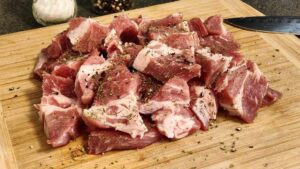Като първа стъпка почистваме, измиваме и нарязваме на късчета свинското. Поръсваме го с пипера и го посоляваме. По желание можем да добавим чубрица или друга любима подправка, след което объркваме месото да се овкуси.