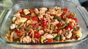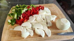 Продължаваме с приготвянето на зеленчуците. Почистваме, измиваме и нарязваме чушките. Лука също, като не е нужно да бъде на ситно. Хубаво е да е на полумесеци. Обелваме и нарязваме на две и чесъна. Тук е мястото да спомена, че по желание могът да се прибавят и гъби.