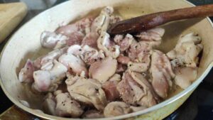 Най-напред си приготвяме пилешкото. Обескостяваме, ако има нужда и нарязваме на кубчета. Посолява се и се подправя с черен пипер.