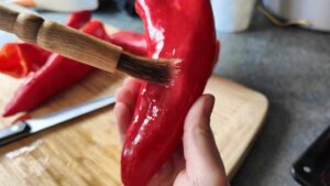 След като напълним всяка чушка я намазваме с олио. Можем да ги намажем и всички едновременно слд като вече сме ги наредили в тавата.