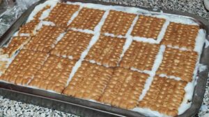 Сега върху крема отново нареждаме от бисквитите. Продължаваме така, ред крем, ред пасти, отново крем и после бисквити. Повтаряме процедурата, докато бисквитите, пастите и крема свършат.