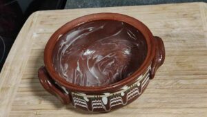 Най-напред си приготвяме продуктите. Нарязваме доматите на дребни парчета, а сиренето ако е много солено е добре да се накисне малко, за да се обезсоли. След това започваме с гювечетата, които намазваме изцяло отвътре с масло. Нанасяме го с ръце, като ползваме половината масло, другата половина оставяме за отгоре. Това ястие се приготвя с повечко масълце.