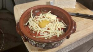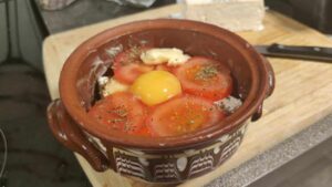 Слагаме на дъното от нарязаните парчета домат. Върху доматите нареждаме плътно плочки (или едро счупени парчета) от сиренето. Подреждаме го така, че в средата да има лек наклон. Там слагаме яйцето, а около него подреждаме останалия домат, който за по-добра визия може да бъде на кръгчета. Добавяме останалото масло, поръсваме с подправките, слагаме и лютата чушка и сме готови за фурната.