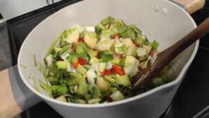 Продължаваме с картофите. Обелваме ги, измиваме и нарязваме на кубчета. Червена чушка слагам малко за цвят и аромат, а и манджата става „по-блага“. После вземаме подходяща тенжера, сипваме олио да загрее и слагаме всички продукти вътре.