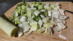 Най-напред си почистваме и нарязваме праза. Режем го на доста едро. В зависимост колко е дебел го раделям на четири и после през около 1-1,5 см.