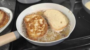 Щом вече сместа е готова, приготвяме филийките и започваме да ги пържим. Слагаме тигана на котлона да позагрее олиото. Филийките хляб потапяме ( и от двете страни ) в сместа и слагаме в тигана. Пържим и от двете страни до златисто.
