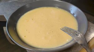 Най-напред си приготвяме сместа за филийките. Слагаме 3-4 с.л. (около 150 гр.) кисело мляко в дълбока чаша или купичка, прибавяме към него содата и разбъркваме добре да „шупне“. В друг съд, в който ще овалваме филийките (широка чиния или тавичка) чукваме яйцата и слагаме щипка сол. Разбиваме ги с вилица, след което добавяме и киселото мляко със содата. Всичко разбъркваме много добре, до получаването на хомогенна смес.