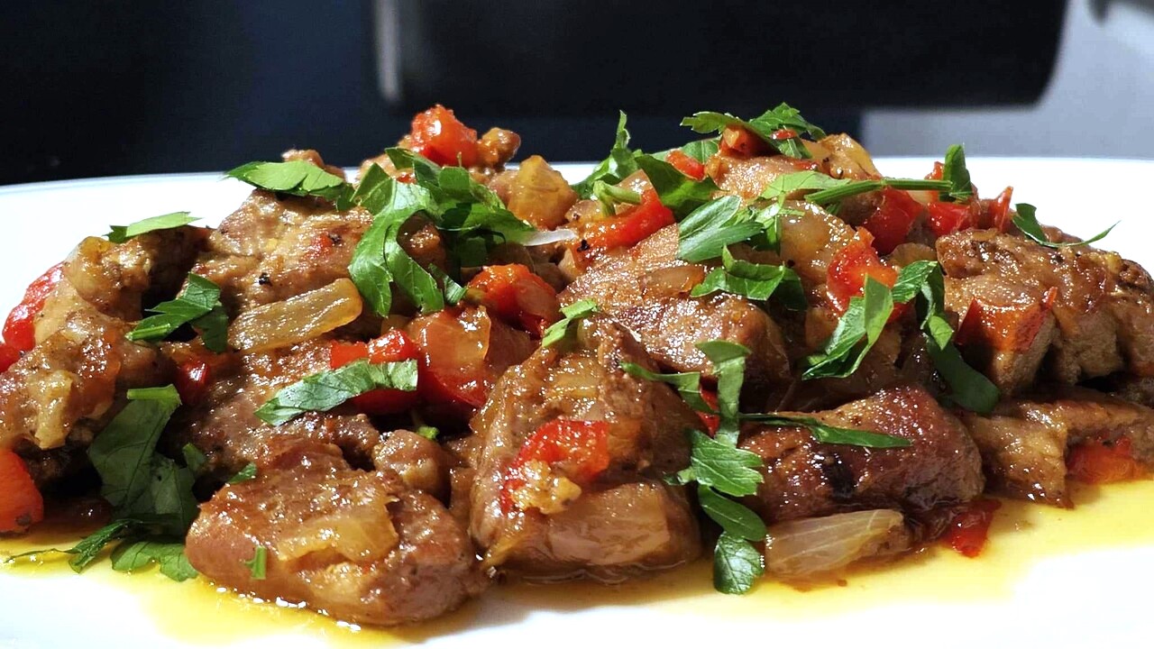 Аламинут със свинско месо, лук и чушки на тиган. Едно превъзходно, лесно и бързо за приготвяне ястие. Приятно на вкус Read more