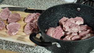 Най-напред почистваме, измиваме и нарязваме месото на шайби (медальончета).