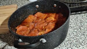 После в подходящ съд смесваме всички продукти за маринатата, разбъркваме добре. После в тавичка или тенджерка подреждаме месото и го заливаме с приготвената марината.