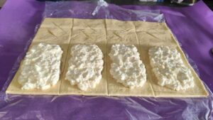 Можем да започнем с приготвянето на плънката. Натрошаваме сиренето в подходящ съд, прибавяме към него едно яйце и единия белтък (втория жълтък го запазваме за намазване), разбъркваме всичко и плънката ни е готова. Преминаваме към оформянето на баничките. Разстиламе тестото на плота и го разрязваме на четири ленти. На всяка лента правим по два разреза от единия край. После гребваме с лъжица от плънката и поставяме по 1/4 от нея върху всяка от лентите. Внимаваме да не отива чак в края на лентата, за да могът баничките да се затворят добре.