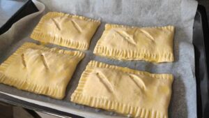 Продължаваме, като прегъваме всяка лента на две и после я запечатваме с помоща на вилица. Всяка от вече готовите за фурната банички подреждаме в тава, на дъното на която предварително сме сложили хартия за печене.
