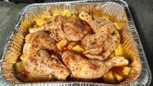 През това време обелваме, измиваме и нарязваме картофите. Режем ги на едри кубчета или ленти. Тук е мястото, който желае и обича (аз лично не слагам) да си нареже и една глава лук. Смесваме пилешкото с картофите и ги разбъркваме така, че картофите също да се овкусят с марината.