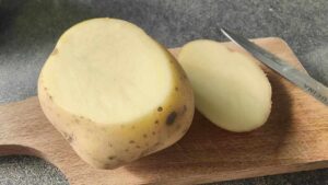 В случая е желателно да ползваме пресни картофи, които много старателно измиваме. Всеки от картофите подрязваме малко от единия край, така че да могат да стоят неподвижни.