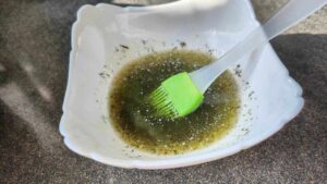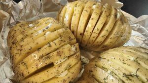 После правим разрези в картофите на разстяние 4-5 мм. Обелваме, почистваме и нарязваме и чесъна на тънко, около милиметър-два дебели шайбички. Във всеки прорез на картофа мушкаме шайбичка чесън, така че да остане леко отворен като ветрило. После в подходяща съдинка смесваме разтопеното масло с една супена лъжица зехтин, солта и копъра. Разбъркваме всичко добре.