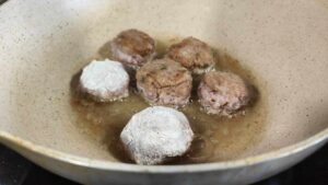 Като за начало си омесваме каймата. Добавяме едно яйце, малко от лука (ситно нарязан), филийка накиснат хляб, малко накълцан на ситно магданоз, сол, друга подправка по предпочитане и месим както обикновено. Щом каймата е готова от нея приготвяме средни на големина кръгли кюфтета. Овалваме ги в брашно и в тиган със загрято олио ги запържваме. Не е нужно да ги пържим до готовност защото после ще ги запичаме.