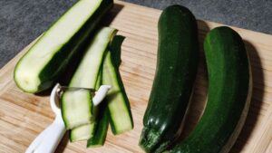 Най-напред почистваме добре и измиваме тиквичките. Веднага след това следва най-важната част – рязането. Тиквичките трябва да бъдат нарязани на много тънко. Много лесно става това, ако ги нарежем с белачката за картофи (зеленчуци). Натискаме и режем по дължина.
