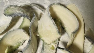 После в голяма купа слагаме студена вода и 10-15 кубчета лед, след което пускаме вътре нарязаните на възможно най-тънко тиквички. Разбъркваме ги добре и ги оставяме за малко в хладилника. През това време си подготвяме брашняната смес (бяло брашно – 1 с.л. и царевично брашно – 1 с.л.) Може също по желание да си приготвим и предпочитан млечен сос.