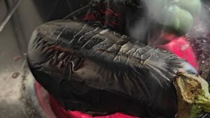 Като първа и най-важна стъпка е да изпечем патладжаните и чушките. Изпичаме зеленчуците добре от всички страни, след което, когато са готови ги изваждаме в тенджера с капак, за да се задушат. Така после по-лесно се обелват.