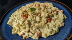 Сега вече е ред на майонезата. Добавяме по малко и разбъркваме. Аз добавям 3 с.л. но в зависимост от това, кой колко обича майонеза може сам да прецени. Нашето кьопоолу с майонеза е готово.