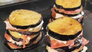 След това е добре да запържим патладжаните за по 1-2 минутки от всяка страна, за да омекнат. Поръсваме с малко сол и черен пипер (по желание). През това време можем да си нарежем на тъничко, сиренето, шунката и домата. Щом са готови патладжаните, започваме да сглобяваме стековете. Намазваме тавичката в която ще ги печем и слагаме от най-големите кръгчета най-отдолу. Върху всяко кръгче поставяме по малко домат, тънки листчета сирене и шунка. Добавяме също по мъничко и от настъргания кашкавал. Редим така до привършване на патладжана и другите продукти.