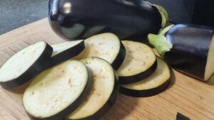 Започваме с подготовка на патладжаните. Нарязваме ги на кръгчета с дебелина 3-4 мм. Ако са от горчивите ги оставяме да се оцедят.