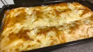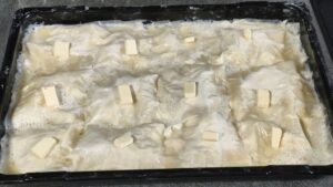 Така подготвена я слагаме да се пече. Печем на 180-190 градуса на най-долното ниво на фурна с вентилатор, докато се зачерви (около 30 мин.)