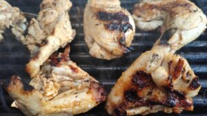 Загряваме скарата, леко намазваме решетките и започваме с приготвянето на нашето печено пилешко peri peri style! Печем парчетата пилешко за около 35-40 минути, като ги обръщате на всеки 5 минути.