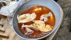 Слагаме месото в голяма купа и заливаме със соса! Можем да завием купата с фолио и да оставим за час в хладилника, да се маринова по-добре. Не е проблем обаче и да се готви веднага.