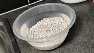 Започваме с подготовката на боба. Измива се добре и в подходящ съд се залива със студена вода. Така той кисне минимум 6 часа или по-добре за една нощ.