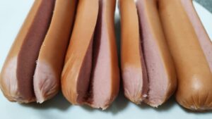 - Обелваме 2 бр. кренвирши и ги разрязваме напречно наполовина. На всяко парче правим разрез по дължина, като целта е не да се разполовят, а само да се срежат.