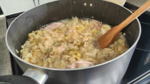 Започваме с киселото зеле, което нарязваме на ситно. Избираме подходяща голяма тенджера, сипваме олиото вътре и слагаме зелето. Можем да включим котлона, за да започне зелето да се задушава. През това време си нарязваме месото на среди парчета и после го добавяме към зелето. Слагаме всички подправки и разбъркваме добре. Наливаме вода докато покрие зелето и го оставяме на котлона да къкри. Ястието се вари, докато зелето омекне (около 2 часа). При нужда доливаме вода или зелев сок.