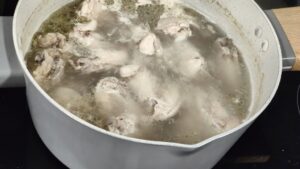 Най-напред баба ми сваряваше крилцата. На печката на дърва, те къкреха, докато месото започне да се отделя. През това време можем да почистим, измием и нарежем зеленчуците.