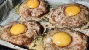 Първа стъпка е приготвянето на каймата. Може да ползвате кайма по ваш избор – свинска, телешка или смес. В голяма купа слагате каймата, нарязания на ситно лук, намокрения и оцеден хляб, подправките и едното яйце. Омесвате старателно каймата и я оставяте за малко за да поеме от уханието на всички съставки. Оформяте големи топки от сместа с вдлъбнатина отгоре (да стане като птиче гнездо) и ги нареждате в намазнена тава, или застлана такава с хартия за печене Пекът се за около 10-12 минути в предварително загрята на 180 градуса фурна. Когато се запекат, изваждат се от фурната и във всяко гнездо се чуква по 1 яйце.