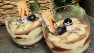 Продължаваме с нов пласт бисквити, които отново покриваме със сладко и накрая заливаме с пудинг. Остава да украсим със предпочитано плодче, част от бисквита, и да сложим по малко от шоколадовия топинг. Нашият десерт е готов!