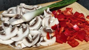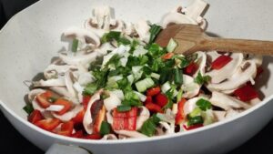 После вземаме подходящ дълбок тиган, слагаме маслото да загрее и сипваме гъбите да се запържват. След една-две минути прибавяме червената чушка, лука и магданоза.