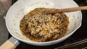Малко преди ориза да поеме всичката течност, сваляме тигана от котлона и по възможност го похлупваме и оставяме настрана.