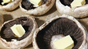 Започваме с почистването и измиването на гъбите. Подреждаме ги в тавата за печене, посоляваме и на всяка гъбка слагаме по малко кубче краве масло.