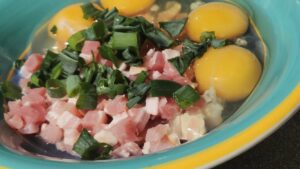 Слагаме във фурната да се пекат. Печем на 200 градуса, докато си пуснат водата и започнат леко да омекват. През това време си подготвяме плънката. В подходяща съдинка смесваме нарязания предварително бекон, яйцата и малко зелен лук.