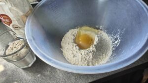 – Смесване на съставките: В голяма купа сипваме брашното и солта. Правим кладенче в центъра и добавяме яйцето,  активираната мая и маслото (зехтина).
