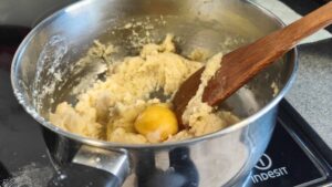 Следва да прибавим яйцата. Тук е много важно да ги добавяме едно по едно. Чукваме едното и бъркаме. Когато се смесят добре, прибавяме следващото. Трябва сместа да стане гладка, мека и лепнеща.